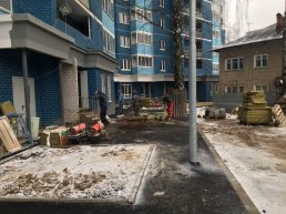 На придомовой территории в настоящее время выполняются работы по благоустройству – укладка асфальта, монтирование малых архитектурных форм. Также производится монтаж плитки при входах в здание.