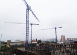 Рядом с третьим корпусом установлен третий строительный кран. Всего на стройплощадке задействовано семь кранов.